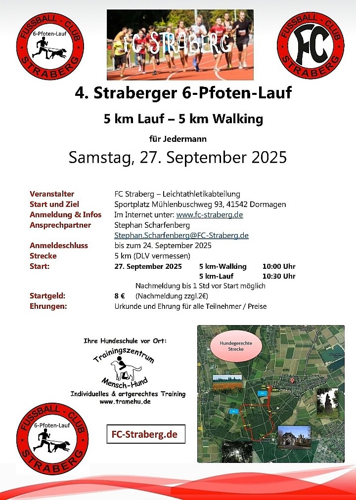 Am 27.09.2025 findet der 4. 6 Pfotenlauf im Rahmen des Volkslauf in Straberg. Wir laden alle Läufer und ihre tierischen Begleiter herzlich zu dieser Veranstaltung ein.