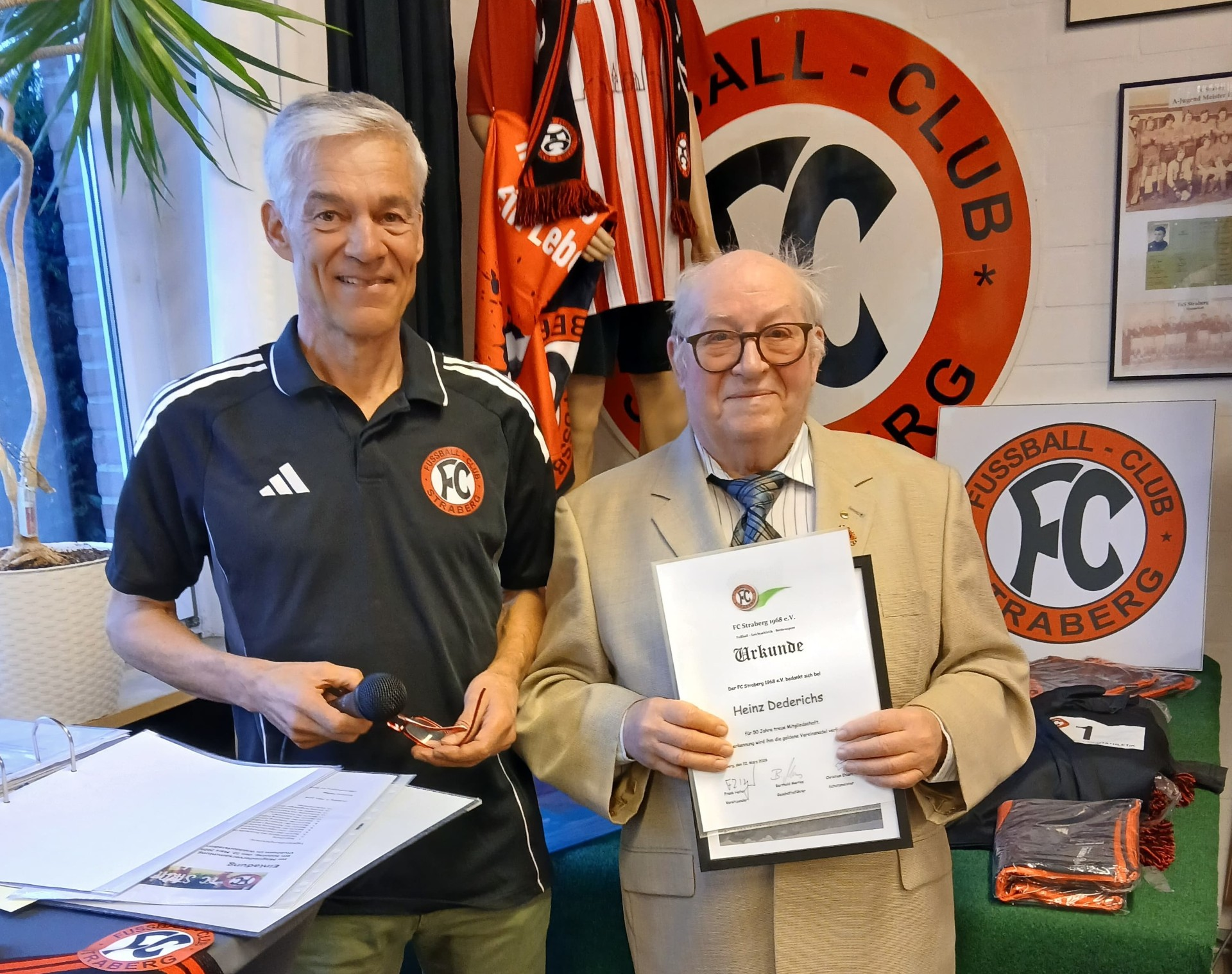 Das Thema Wertschätzung nimmt bei jeder Mitgliederversammlung des FC Straberg breiten Raum ein. Mit der goldenen Verdienstnadel für 50-jährige Mitgliedschaft wurde Heinz „Heintje“ Dederichs geehrt – unter anderem hatte der ehemalige Straberger Schützenkönig 20 Jahre lang ehrenamtlich mit einer Frau den Grill bei den Tagen des Fußballs bedient. „Heintje“ nannten sie ihn augenzwinkernd, weil er regelmäßig dank seiner Sangeskünste die Jugend-Weihnachtsfeiern bereicherte. Weitere Akte der Wertschätzung im Rahmen der Mitgliederversammlung im Stenogramm (dazu Bildergalerie): Für 25-jährige Mitgliedschaft wurden etliche silberne Verdienstnadeln nebst Urkunden vergeben, zur goldenen Hochzeit erhielten die langjährigen Clubheim-Wirte Scheng und Dagmar einen großen Blumenstrauß. Die Fußballer dankten deren Tochter Heike ebenso mit Blumen für ihr Engagement wie Silvia Neuen als Dank für die Trikotpflege.