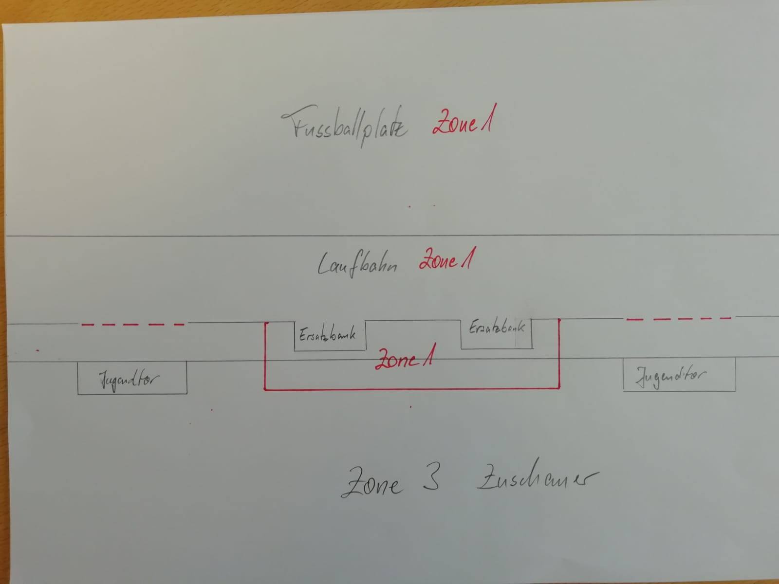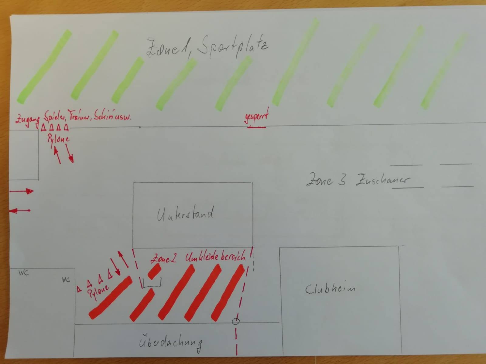 →Die Sportanlage ist in Zonen eingeteilt (siehe Bilder bzw. Skizzen). Die Zonen 1 und 2 dürfen nur von unmittelbar am Spielbetrieb beteiligten Personen betreten werden (Spieler/Trainer/Betreuer/Schiedsrichter/Hygienebeauftragter–nachfolgend Aktive genannt).